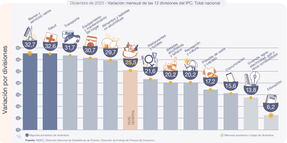 Los rubros más impactados por el sinceramiento de la inflación reprimida por el gobierno anterior fueron; «bienes y servicios varios» (32,7%) principalmente productos de cuidado personal, le siguieron «Salud» (32,6%) por medicamentos y medicina prepaga y «Transporte» (31,7%) debido principalmente a los combustibles.