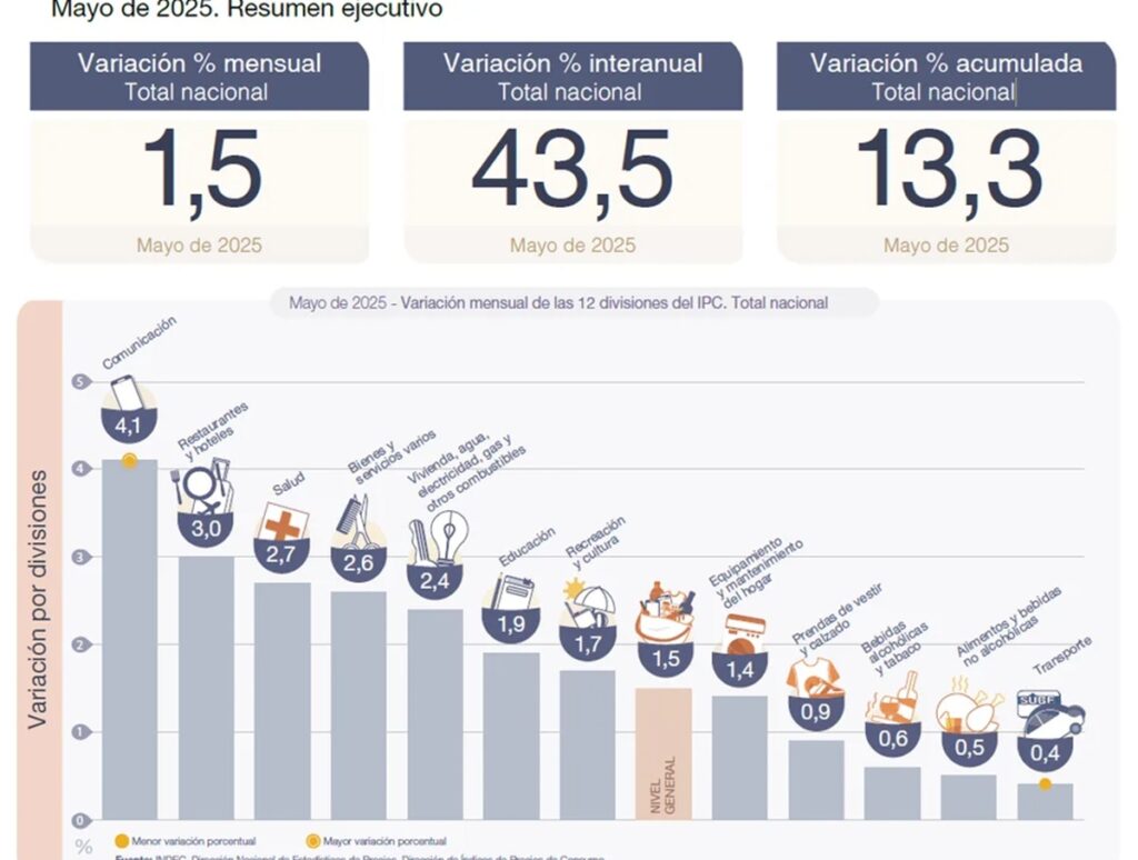 El costo de vida subió 1,5 por ciento en mayo último mientras que la inflación interanual fue del 43,5%.