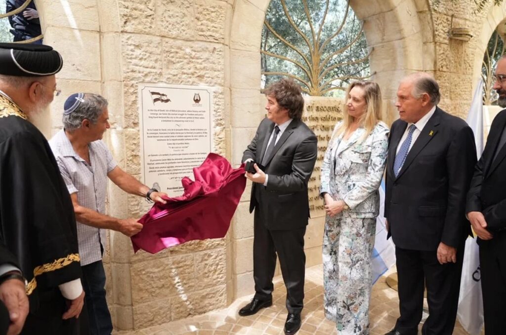 Por su parte, el libertario encabezó además una pequeña y austera ceremonia de inauguración de una placa en la Ciudad de David en reconocimiento a la defensa a lo que la administración libertaria reconoce como “la causa de la libertad”.
